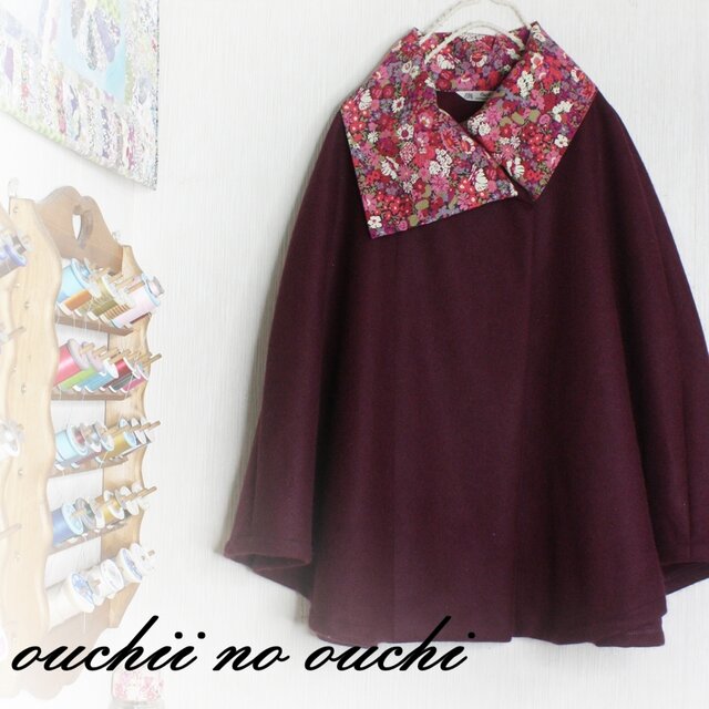 ウール100ボルドー(弱毛羽立ち高級コート生地)とLIBERTYリバティプリント・コーデュロイ Thorpe≫(ソープ) で大き目カラーのポンチョをお作りしました。
