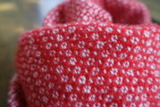 経糸(たていと)の赤の中に白いかすみ草が咲いているような織です。
