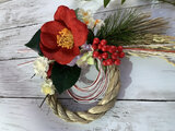 赤い江戸椿をメインに、赤と白を基調に仕上げたお正月飾りです。