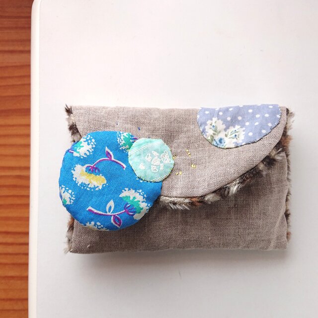 そんな思いがあって丸をどこに縫い付けようか、悩んだ末にわたしが気に入った配置はカードケースからこぼれ落ちそうな位置。