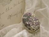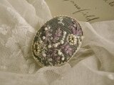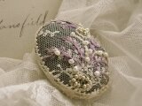 繊細な刺繍の施されたアンティークレースの上にライラックの糸で