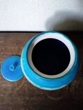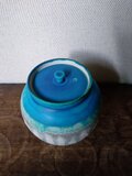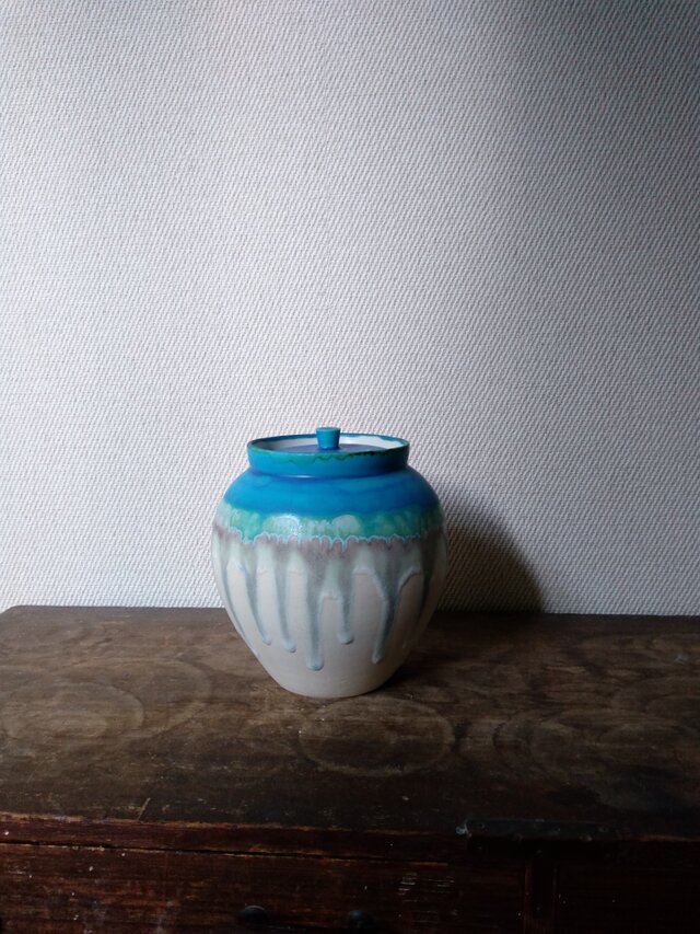 クリーム色と青色の二色の釉薬を組み合わせた壺です。蓋付きなので保存容器としてもお使い頂けます。現代的な陶磁器が好きな方にオススメです。