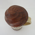 蓋にはダークなウォールナットを用いて、螺旋状に頂点に向かって登っていくかのような溝を彫り込みました。ジョッキからあふれるビールの泡のごとく、ふわりとしたフォルムにまとめました。