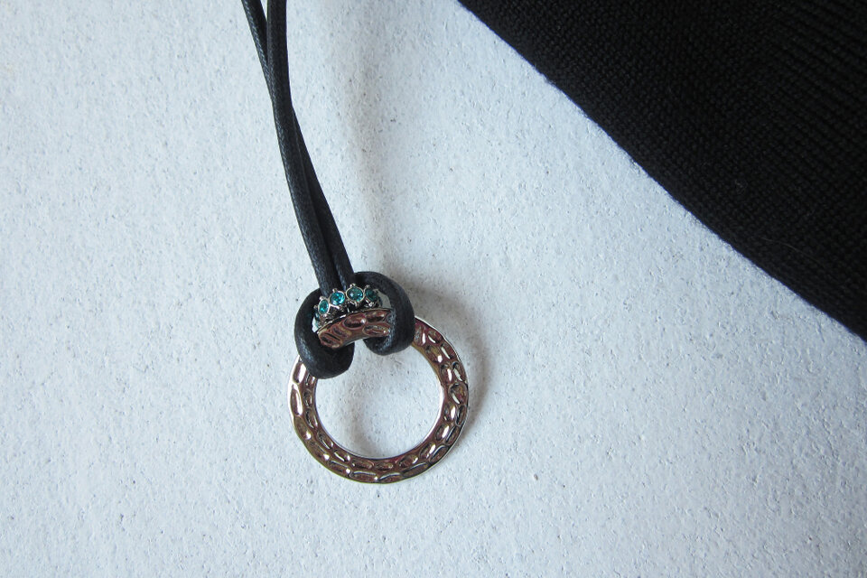 コードの色はブラック。眼鏡を掛けるリングはシルバー。そしてポイントにしたロンデルはシルバーの枠に鮮やかなブルージルコン。コードのブラックとロンデルの鮮やかなカラーがメリハリのあるホルダーです。