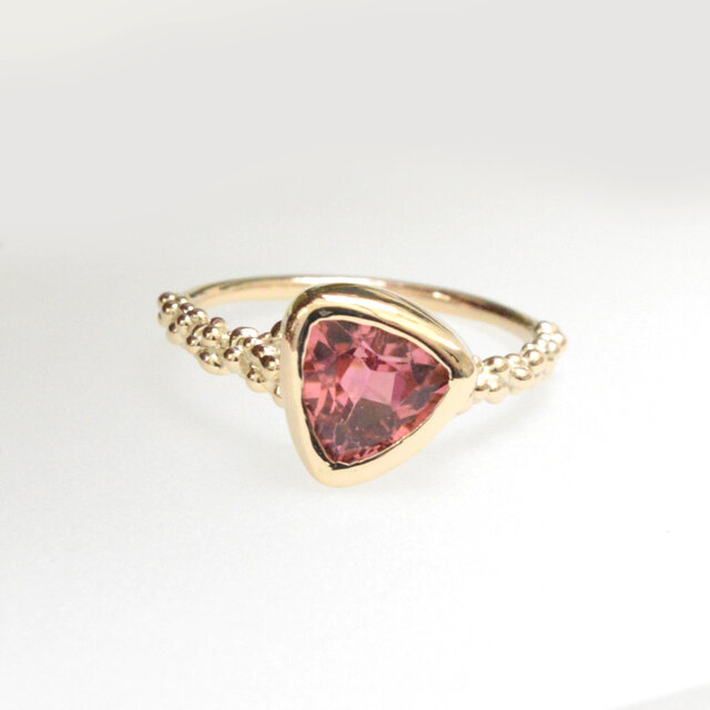 トリリアント・ミックス・カットのピンク・トルマリンは、面のひとつひとつに光が反射して美しく煌きます。