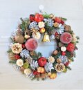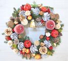 こちらは白い松かさが盛りこまれたリースベースを用いており、しっかりとした作りとなっております。