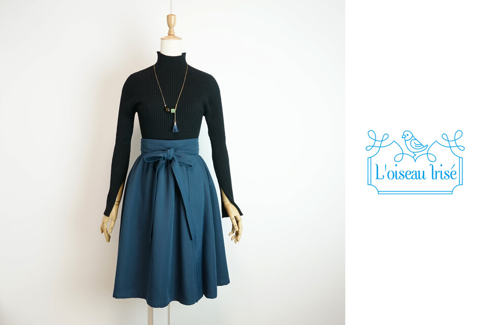 奥身ベルト穴から出したリボンを、二重で結ぶタイプの巻きスカートです。
