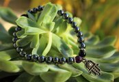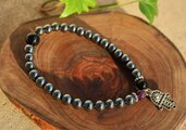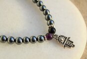 中心にシルバーのハムサハンドのパーツ、6mmのアメジスト、6mmのヘマタイト、最後に8mmのオニクスを組ませました。