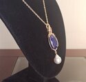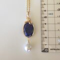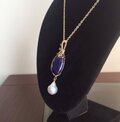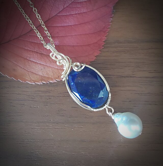 表面にカットの施されたラピスラズリを14金ゴールドフィルドワイヤーでラッピングし、白蝶バロックパールを繋いでペンダントトップに仕立てました。