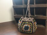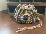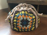 グラニースクエアモチーフ5枚を筋編みでつなぎ合わせたキューブ型の巾着です。