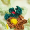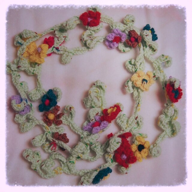 ミントグリーン(ネップ)の毛糸に小花のモチーフを散りばめたラリエットです。