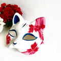 お面はペイントで仕上げている物が多いのですが、Momo太郎の猫面は一閑張りの技法を生かして着物や和紙を張り、制作しています。