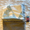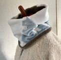 このくまさん、切り取って、白いフリースと合わせると、まあ、なんて素敵なんでしょう。子どもっぽさが払拭されて、まるで雪の中の情景のようですね。