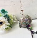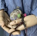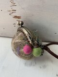手のひらサイズの球体の羊毛フエルトがま口で、バックの外付けができるタイプです。
