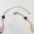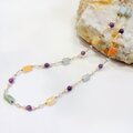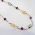 グリーンカイヤナイトとオレンジのチベットメノウをメインに、パープルのレピドライトやピンクパールを取り入れ、やさしいミックスカラーのネックレスに仕上げました。