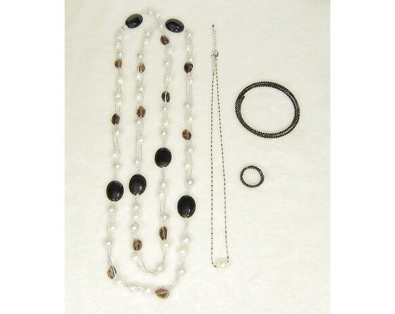 光沢の美しい大粒のオニキスと本真珠(淡水)などのロングネックレス、本真珠(淡水、ナチュラルカラー)の一粒ネックレス、ブラックスピネルのリングとブレスレット(共に形状記憶ワイヤー、フリーサイズ)の4点セットが入った福袋です。