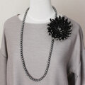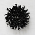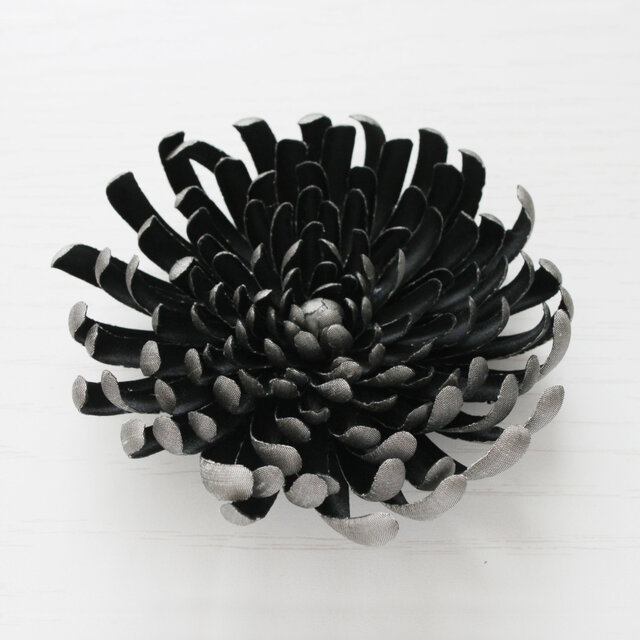 花びらの両面に上質な生地を使った糸菊のコサージュです。表面はつやのあるコットンシルクのサテン、裏はシルバーグレーのシルクシャンタン、贅沢な素材の組み合わせです。直径約11㎝でサイズは大きいですが軽いコサージュです。結婚式やパーティーなどフォーマルな場面や、和装のヘアアクセサリーとしても活躍しそうです。