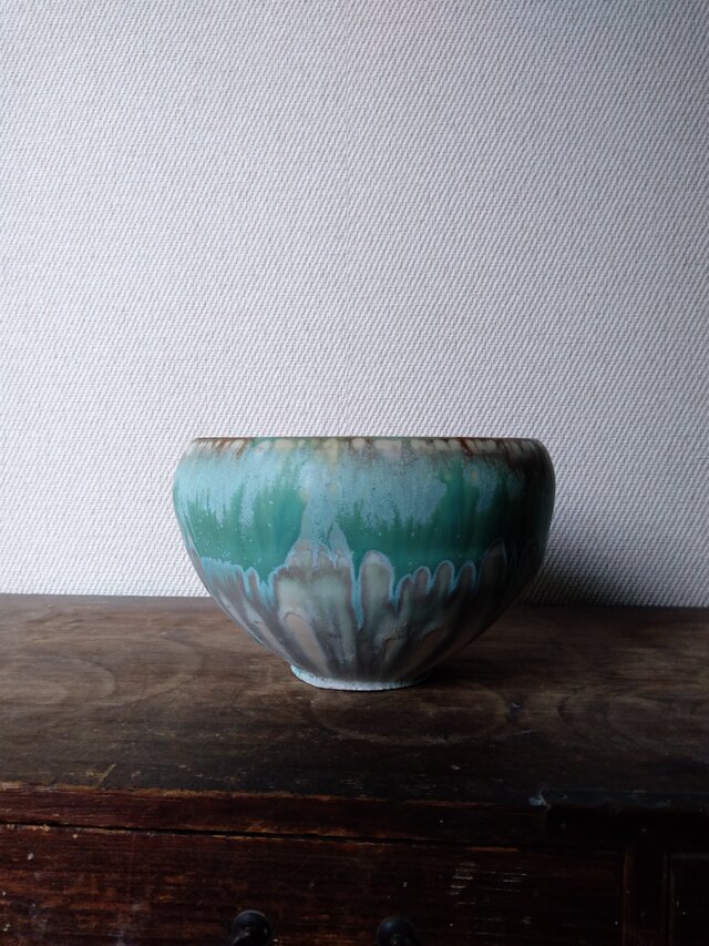 磁器で出来たボウルです。混ざりあった二色の釉薬がとても面白い景色を生み出しています。