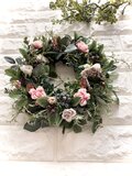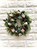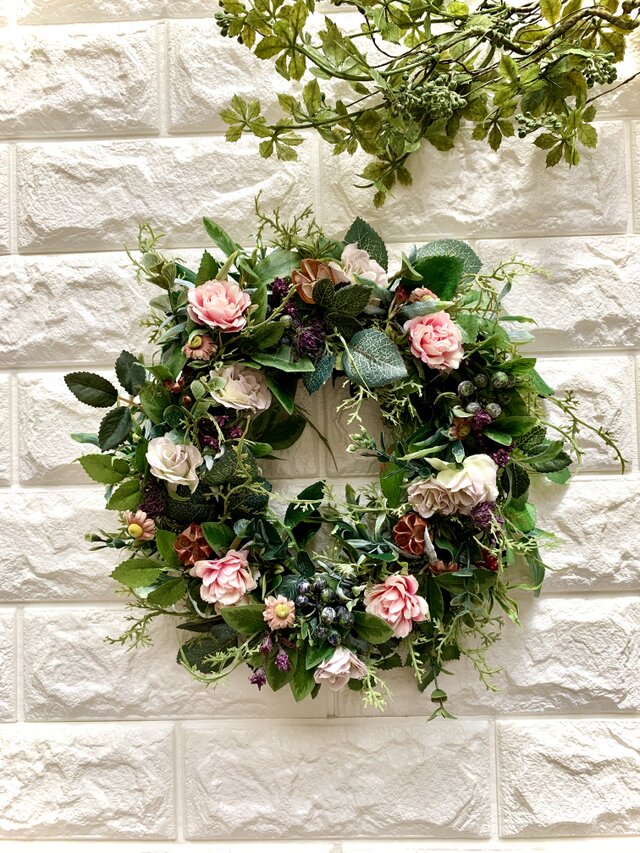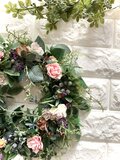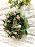 多種類のリーフとニュアンスカラーとピンク色のローズ・小花をアレンジしたリースです。