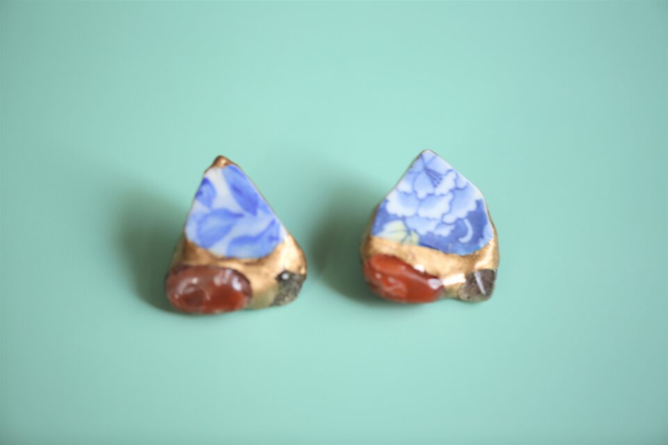 海から長い時を経て流れてきた陶片と、天然石を金継ぎで繋ぎ合わせて仕立てたピアスです。