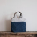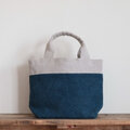 五倍子と藍を重ねてブルーグレーに染めたリネンでトートバッグをつくりました。