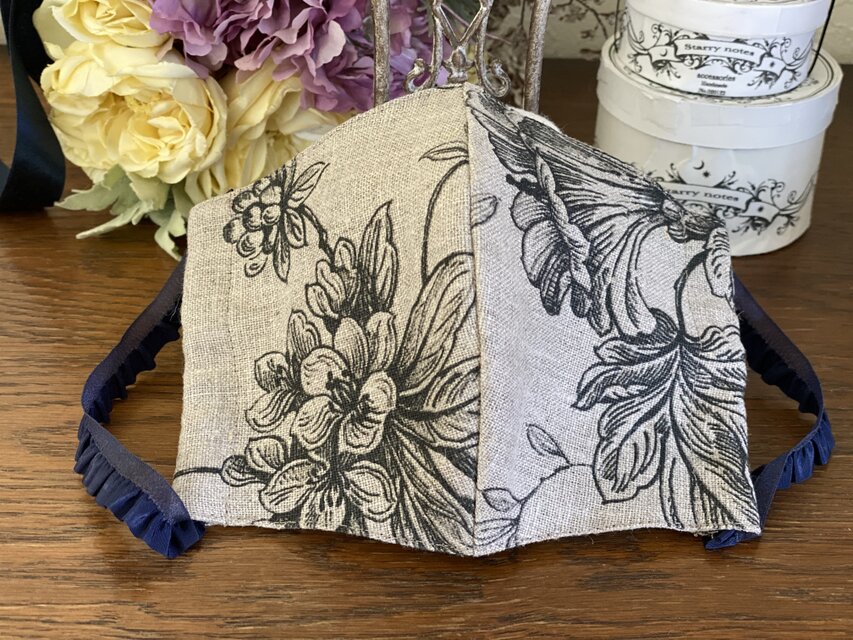 イギリスインポート生地 麻100%のお花柄の手作りマスク リネンマスク