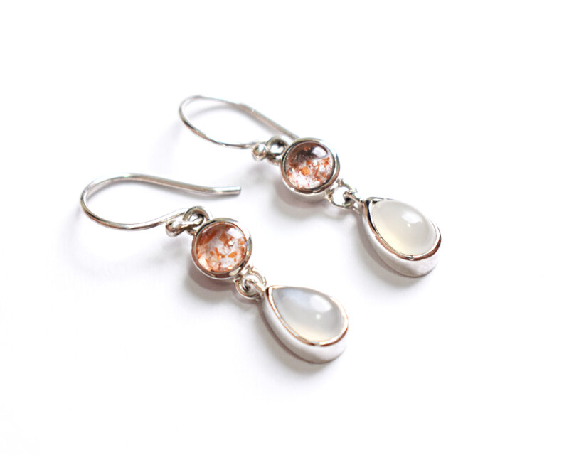 乳白色のまるで月の光を宿したようなムーンストーンとキラキラと光り輝くオレンジ色のサンストーンで太陽と月のピアスを制作いたしました!