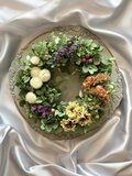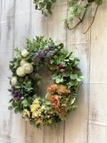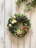 黄、紫、白、オレンジと本来ですと引き立たせてしまう色ですが、こちらのリースは優しい色ですので心落ち着く色合のリースです。