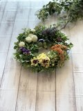 数種類のリーフにお庭から摘んできたお花を、グループに分けて寄せ植えをしたようなリースです。