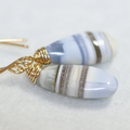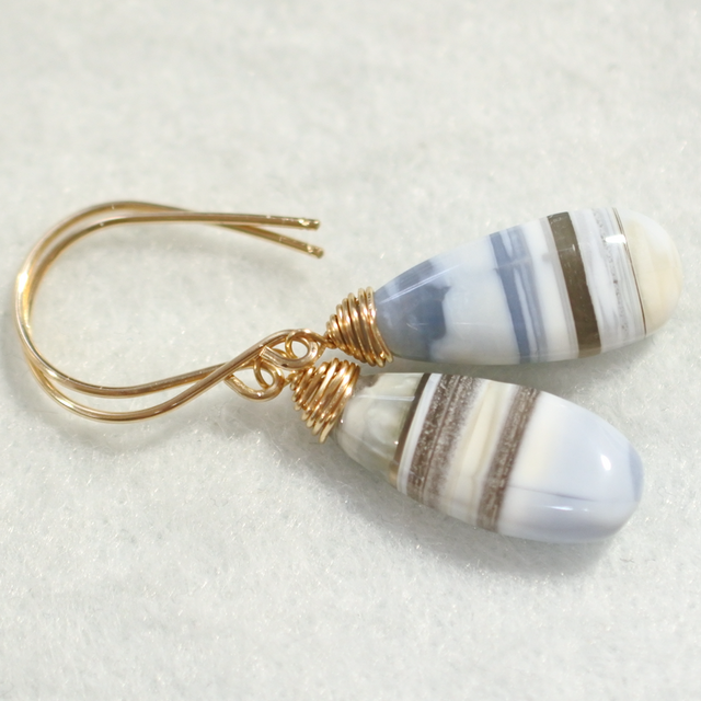 見事な天然のストライプが魅力的なブルーオパールの縦長ペアシェイプを使ったシンプルなピアスです。