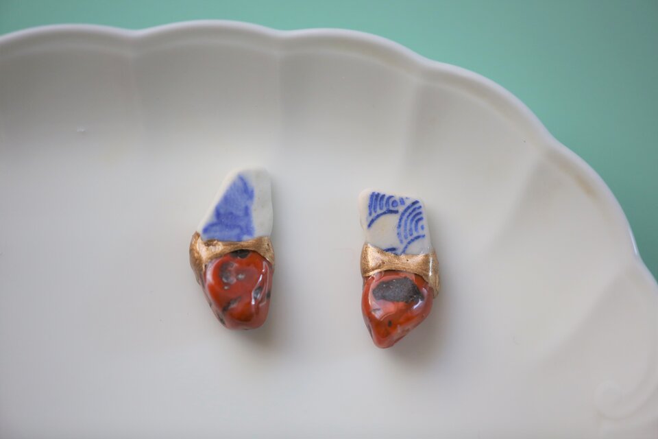 現在版の金継ぎですので漆の木の樹液で作る本漆とは異なり かぶれにくい新うるしと金粉(真鍮粉)を使用した簡易の金継ぎ手法でアクセサリーをつくりました。