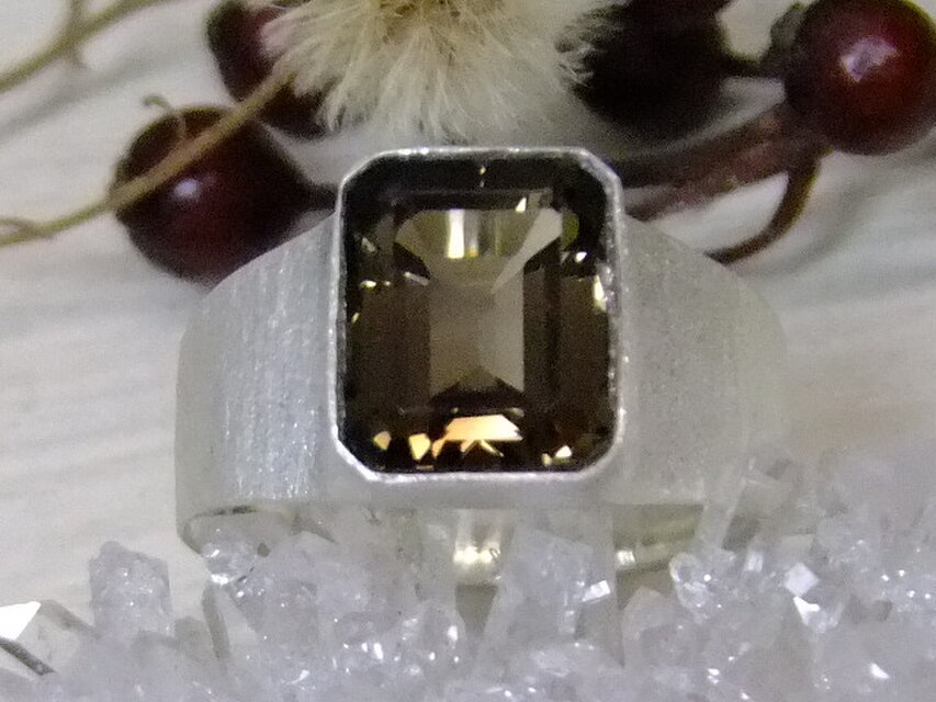 シックな色合いのスモーキークォーツのアンティーク調シルバーリング*重くなり過ぎないよう薄めに製作したやや幅広のリングは古鉄錆のようなマット仕上げ、10~18号(推奨サイズ)の範囲を目安に調整可能、サイズ確定後にマットな覆輪で石留め致します*煌めきが良くクラックの無いクリーンなスモーキークォーツをお楽しみ下さい*通常、黒化遅延処理を施しますが銀そのものの変化をお好みの場合は処理不要とお申し付けください*黒化防止ロジウムコーティングやK18コーティングをご希望の場合は承ります(別途1000円)