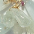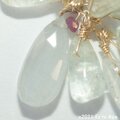 メインはモスが少なめの宝石質モスアクアマリンAAAのロングペアシェイプを下げるワイヤーに、小さな宝石質ルビーAAAのボタンカットを通して留めました。