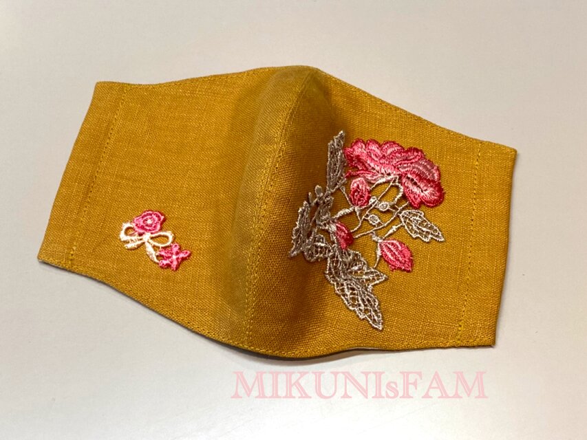 大きな薔薇の立体的な刺繍を丁寧に縫い付けたマスクです。