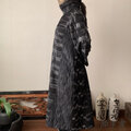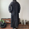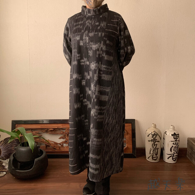 ハイネック、上半身総ピンタック手織り綿長袖ワンピース 高め襟と後ろ上下に走るボタンですっきり着こなし 黒グレイ絣