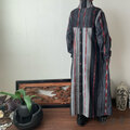 ハイネック、上半身総ピンタック手織り綿長袖ワンピース 高め襟と後ろ上下に走るボタンですっきり着こなし 黒グレイ絣赤ライン