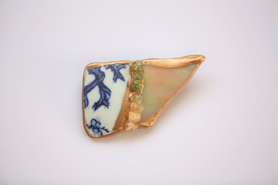 長い時を経て流れ着いたシー陶器と様々なパーツを使用し、呼び継ぎの技法で唯一無二のブローチができました。