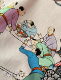 皆でワイワイ宴をたのしむ絵柄なのでクロスの上にお茶やお菓子、お酒のおつまみなどを並べると、独りでいても植毛刺繍のモチーフたちと一緒に飲んだり食べたりしているような気分になれるかもしれません。(当店主観)お家時間のお供に是非どうぞ。