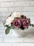 アンティークな陶器にクリーム色とスモーキーピンクの二種類のバラとを使ってボリュームたっぷりな存在感のあるアレンジです。