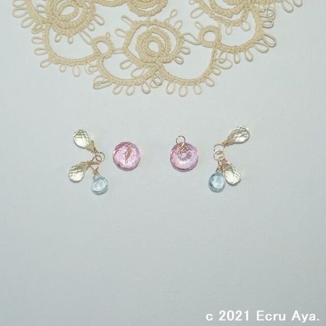 今回は鮮やかなピンクの、ピンクトパーズのオニオンブリオレットカットをメインに、春らしいカラーのピアスチャームをお作りしましたので、良かったらご覧下さい。