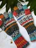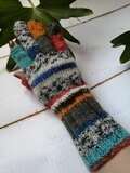 元気なオレンジ色やカーキ、水色の色合いの、手編みのスマホ操作対応手袋です。