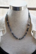 濃いグレーの地から、青白い光が浮かび上がる幻想的なラブラドライト(8mmボタンカット型)をシルク糸で結びながらつないでいったネックレスです。