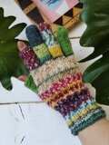 春の花畑みたいな色合いの、手編みのスマホ操作対応5本指手袋です。
