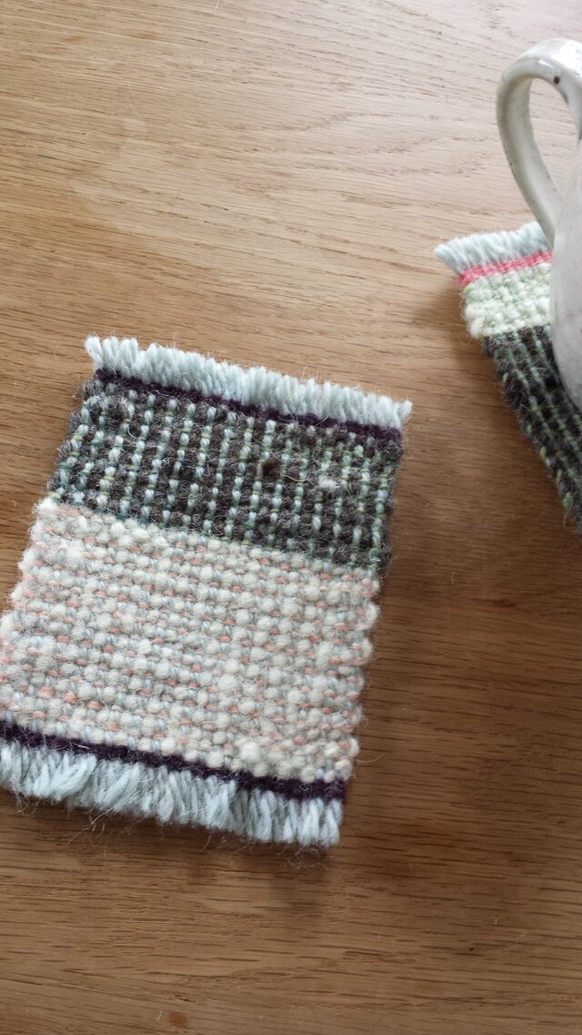 寒い冬の温かな飲み物。そんなホッとする時間をもっと温かくする羊のコースターを織りました。