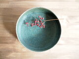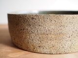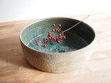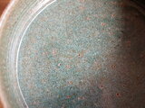 外側は焼き〆で土が錆びた様な質感で、内側は淡い青緑緑色の釉薬です。