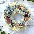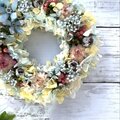 優しいライトブルーのブルースターとアキレアをモーニングイエローのアジサイ合わせた明るい雰囲気のリースです。