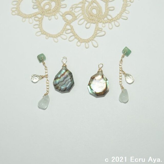 メインのアバロンシェルXクリスタルのダブレットは、最近流行のラフスライスカットなので、シンプルに一粒下げました。