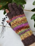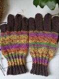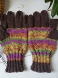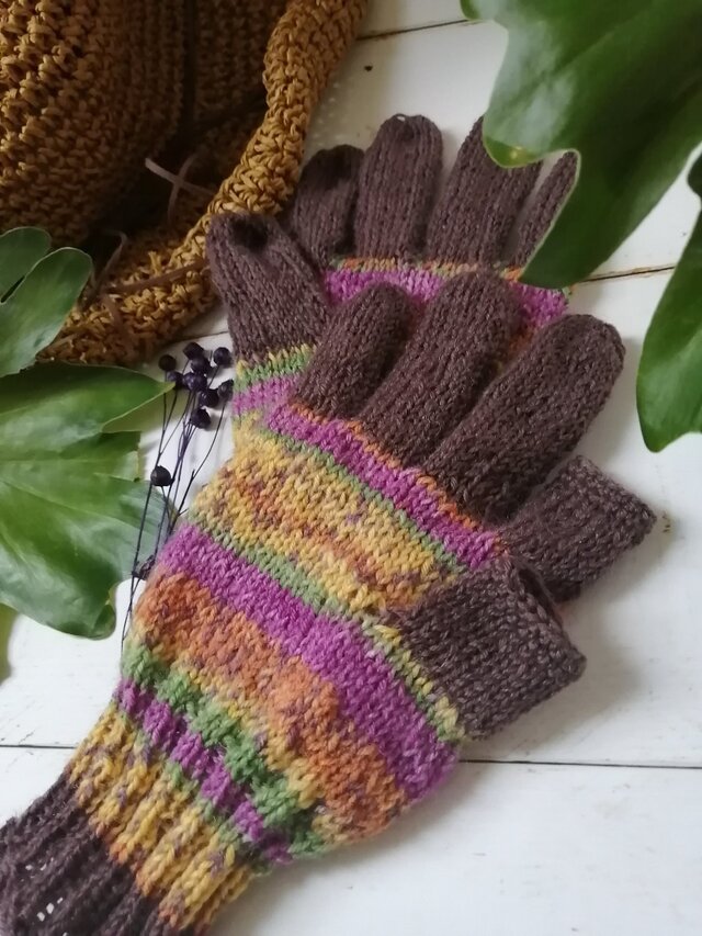 砂糖飾りを散らしたチョコレートドーナツのような色合いの、手編みのスマホ操作対応5本指手袋です。