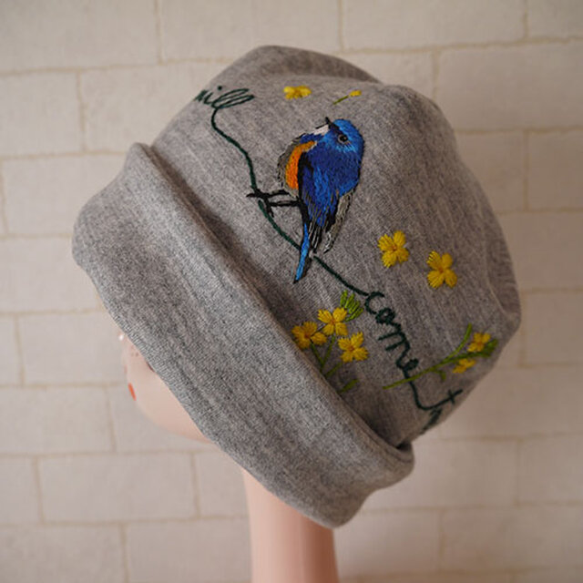 青いルリビタキと黄色い菜の花を組み合わせて刺繍をして見たくてこの側になりました。