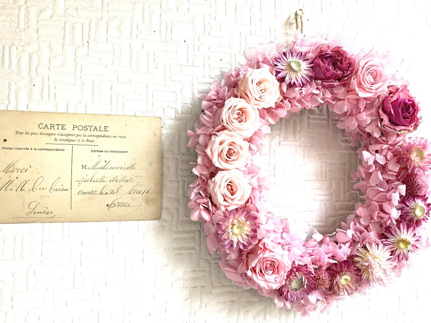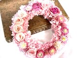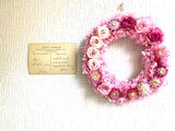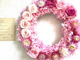 ピンクの紫陽花とローズでロマンティックカラーのリースを作りました。